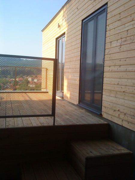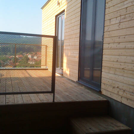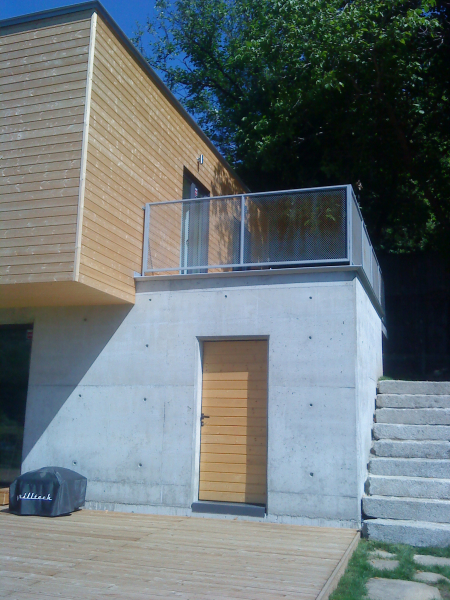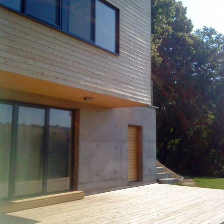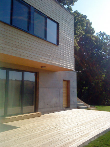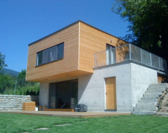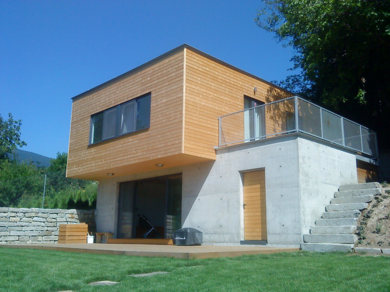 Къщата е предвидена за имоти с по изявен наклон. Първият етаж е вкопан, а втория е изпълнен изцяло от дървена конструкция. Изпълнената сграда се предлага за проектиране и изпълнение, включително и интериора.